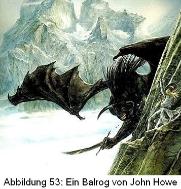 So ist offensichtlich, dass die Illustratoren sich hier an das biblische Bild des gehörnten Satan anlehnen: Besonders die Assoziation der Balrogs mit Feuer prädestiniert sie für solche Darstellungen - ebenso wie ihre Rolle als hohe Vertreter des Bösen. Sogar die Neuverfilmung des LotR von Peter Jackson scheint die gehörnte Variante zu favorisieren15.