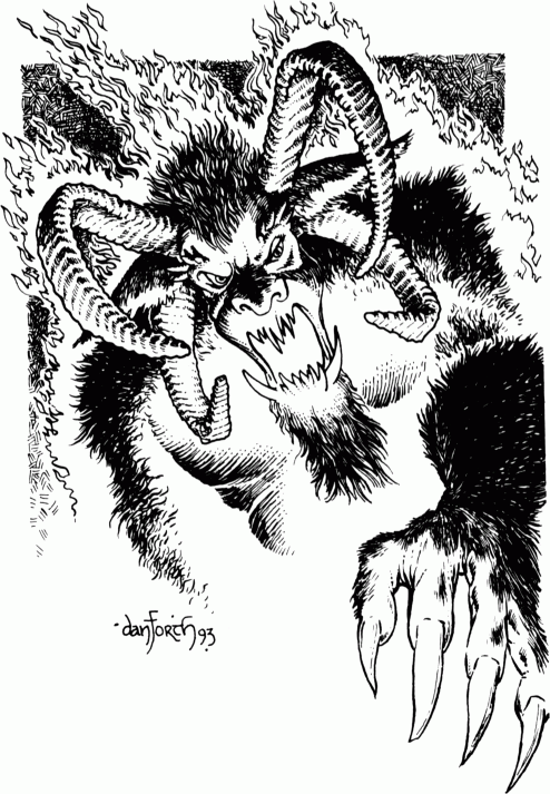 Betrachtet man die grafischen Darstellungen von Balrogs (Abbildung 53, Abbildung 54), so fällt vor allem auf, dass sie oft mit 2 oder sogar 4 Hörnern dargestellt werden12, obwohl bei Tolkien keinerlei Hinweise auf Hörner zu finden sind: So beschreibt er lediglich die flammende Form, die Flügel, die Peitsche und das Schwert des Balrog: