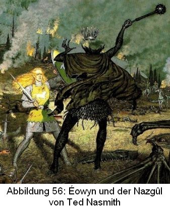 Die Nichte König Théodens erschlug in der Schlacht um Minas Tirith den Ersten der Ringgeister (Lord of the Nazgûl). Dabei gelang ihr dies nicht unbedingt, weil sie eine unbesiegbare Kriegerin wäre (was sie mit Stufe 8 - noch - nicht war1), sondern weil sie damit die Prophezeiung vom Ende des Witch-King erfüllte: Éowyn hatte sich als Mann verkleidet, um unerkannt gegen den Willen ihres Onkels2 mit in die Schlacht zu ziehen. Als Théoden vom obersten Ringwraith erschlagen wird, konfrontiert sie diesen, indem sie die Herausgabe des toten Königs verlangt. Dem Nazgûl, den sie aufhalten will, war aber prophezeit worden: "...not by the hand of man will he fall"3, und so verhöhnt er sie nur mit den Worten: