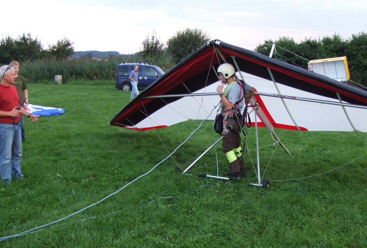 Startbesprechung: links im Bild der Startleiter (und Fluglehrer). Im Gegensatz zu Segelflugzeugen und Gleitschirmen brauchen Drachenflieger zwei Schleppleinen (bzw. ein Seil mit zwei getrennten Enden), da sonst während des Steigens das Seil "durch" den Steuerbügel wandern würde.