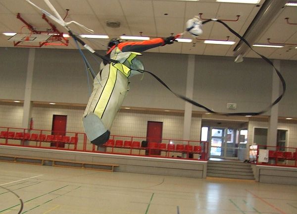 Was liegt also näher, als das Auslösen und Werfen des Rettungsgerätes in praktischen Übungen einzuschleifen, damit es im Notfall auch ohne Nachdenken funktioniert? Die folgenden Aufnahmen entstanden bei einem Retter-Training, das mein Fluglehrer Markus Berghaus 2007 in der Axtbachhalle in Beelen organisiert hatte.